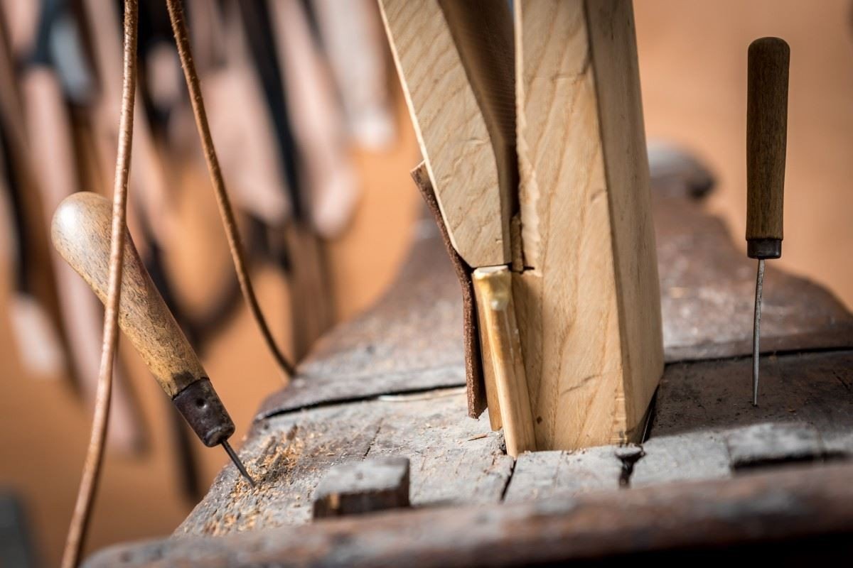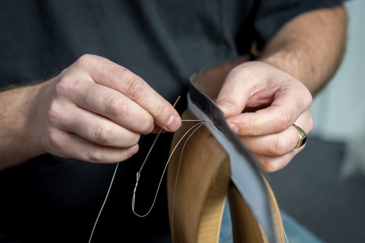 A saddle stitch is created in general with two dull needles at the opposite ends of a single common thread. The right thread must be used to create a strong stitch (we use high-strength waxed thread with a diameter of 0.6-1.2 mm); the stitched work must be fixed the entire time in a stitching pony or a clamp. The stitching pony creates a clamping jaw in which the stitched material is held so that its edges protrude only enough to allow the puncturing of an opening with an awl and the proper interconnection of stiches. The person hand sewing the article always stitches towards themself, with the front side of the fabric facing right in the clamp. The stitches are made at a slight angle and appear the same on the front and back of the material. Sewing begins by first passing the thread through the first hole so that each needle ends up on an opposite side of the stitched piece. The needles are then passed simultaneously through the next holes towards each other, with the thread crossing in the holes and alternately passing from one side of the material to the other.