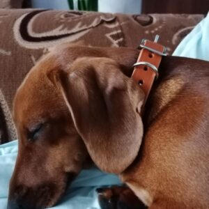 Hand-made leather collar 2 cm riveted, made of dark brown leather. The narrow collar is only suitable for small dogs.