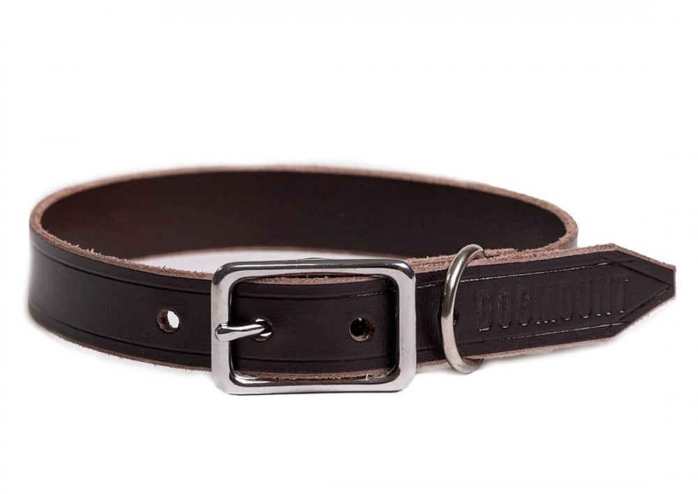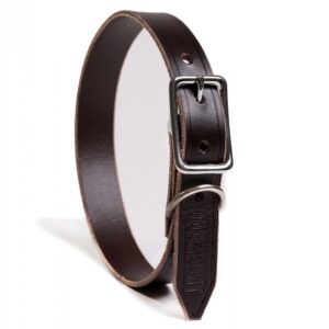 The handmade riveted leather collar with a 3/4″ width is made from dark brown leather. The narrow collar fits best with small breeds.