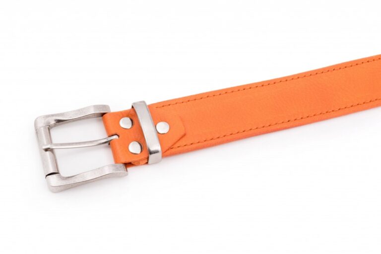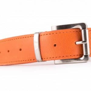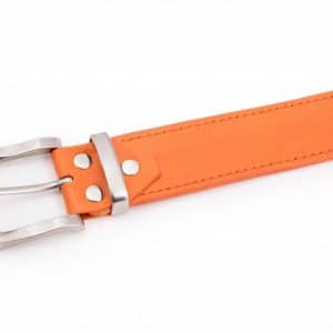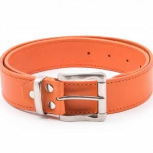 A handmade orange leather belt with handmade stitching of the two layers. The alpine cow leather with a greater stiffness is tanned in Italy or Germany using one of the oldest leather tanning methods – vegetable tanning. Colored leather is chrome tanned. The two layers hand stitched with high-strength waxed threads with an overall thickness of c. 3.5 mm ensure that the belt is both strong and flexible. The leather belt is furnished with a cradle saddle buckle and is suitable for all occasions, including the most formal.