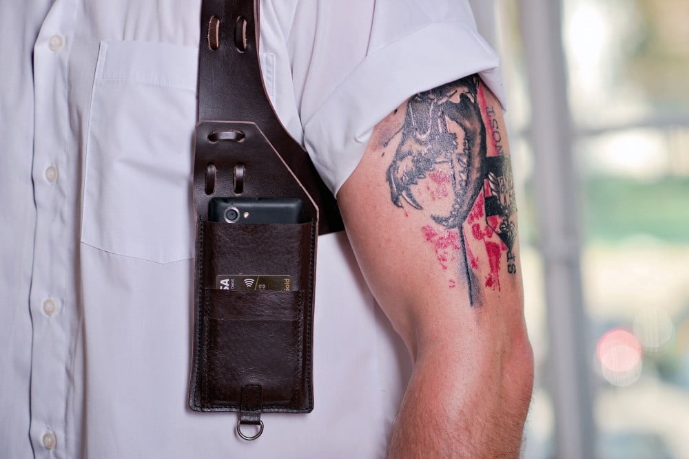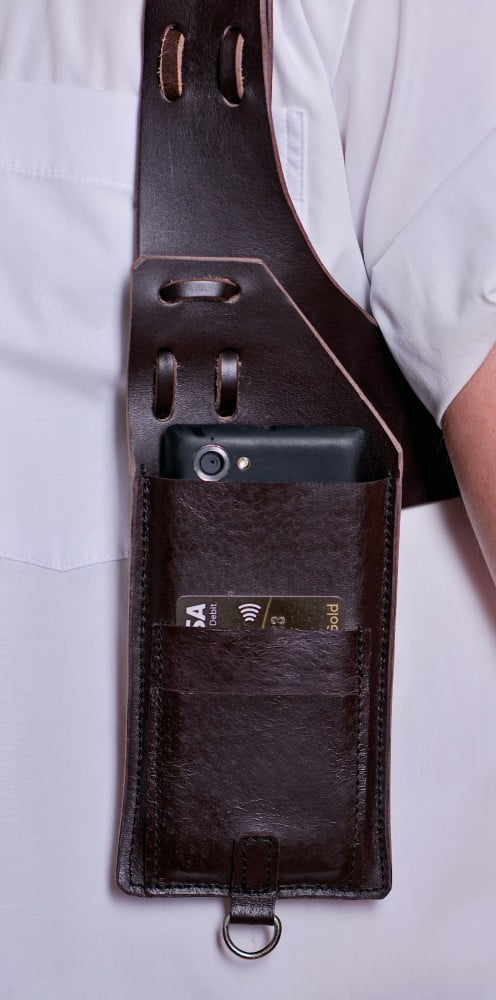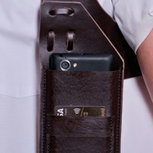 While completing your look, the leather case for your mobile will save you plenty of space in your bags or pockets. The leather case can be customized – you can add different elements or remove the pockets. You can choose between four basic types of leather and pick out your thread color.