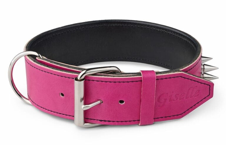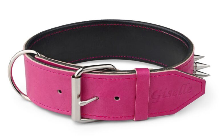 Do you have a gentle dog soul or princess at home? Then this collar is the right choice. Pink spiked dog collar is completely handmade and hand-stitched from two layers of high-quality leather. While the soft pink leather on the outside expresses tenderness, the black leather on the inner side balances the sweetness and strengthens the whole collar. Spikes fine-tune the overall appearance, and are not only spectacular but serve to protect your dog. Our working name for this leather collar is “prickly romance”. You can set the collar in the right design menu, including the stamping of the dog’s name on the end-tip of the collar.